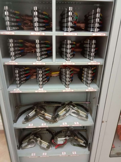 上面一組安全工具柜的存儲則是簡單暴力,兩層接地線,分別由支架固定,其中低層兩邊也分別放兩排。整體看起來整體規范,具有較強的視覺沖擊。