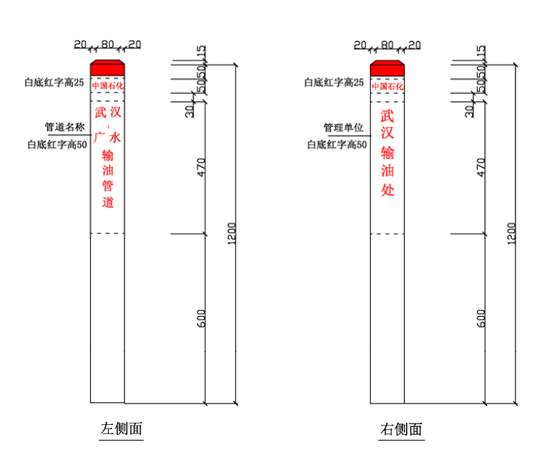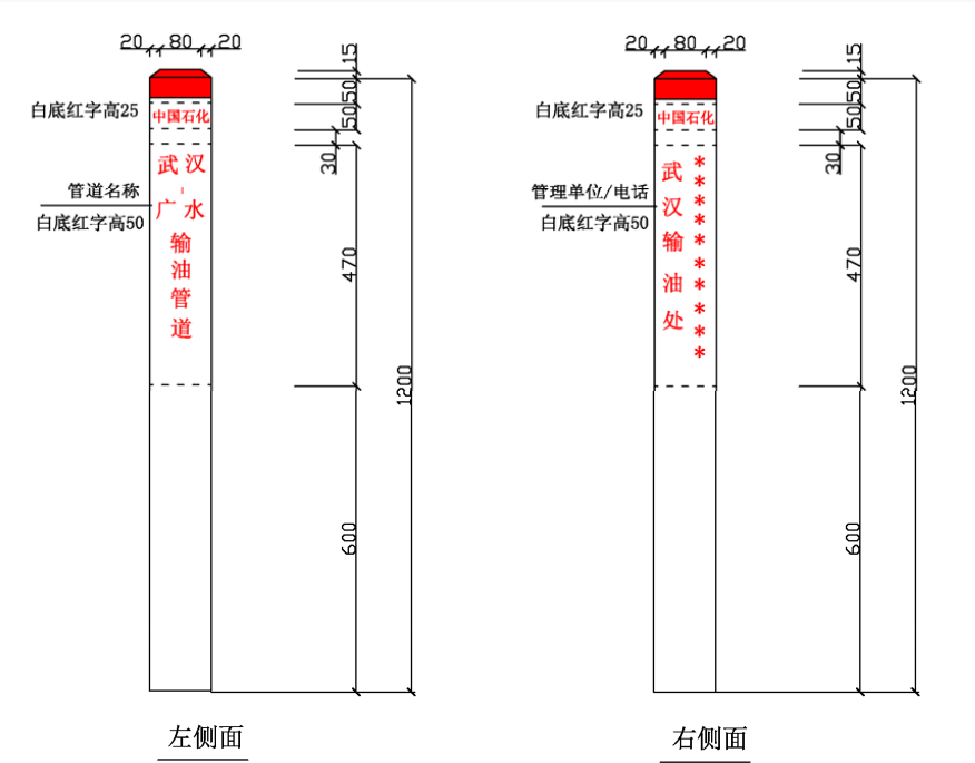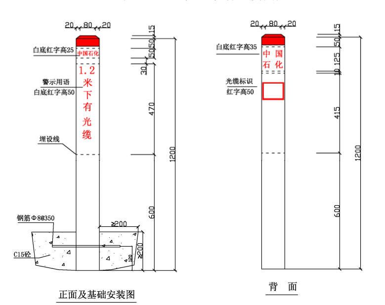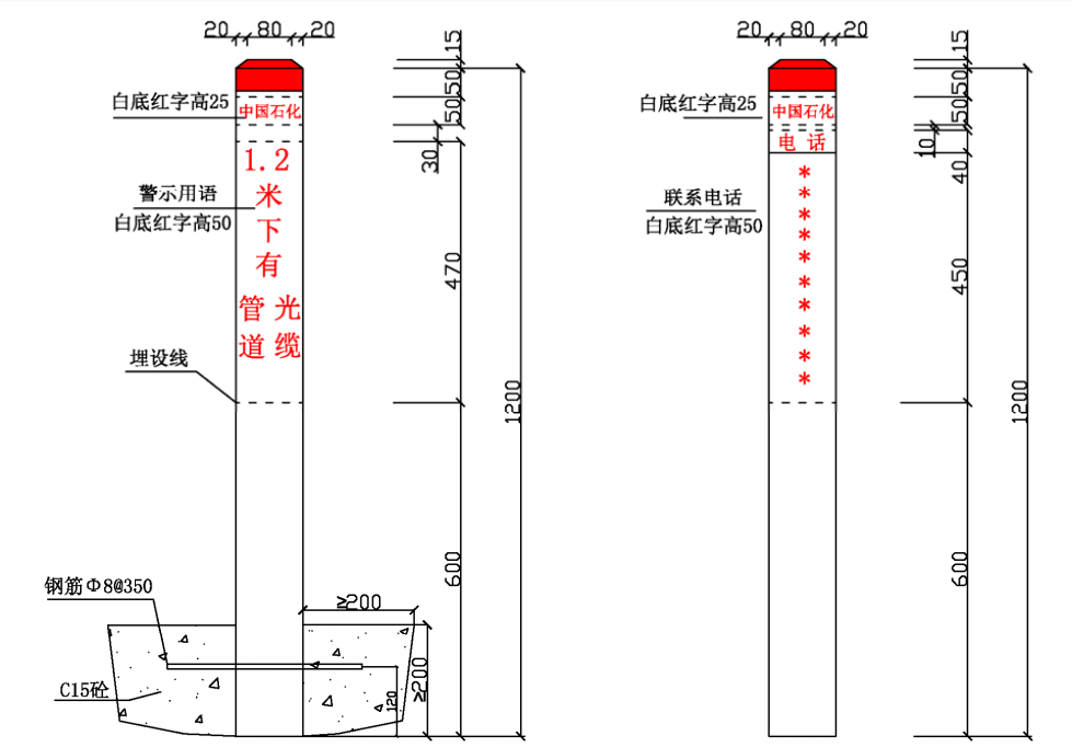 ⑴ 加密樁/通信標(biāo)識均標(biāo)注中國石化名稱、管道名稱、警示用語、管理單位和聯(lián)系電話。