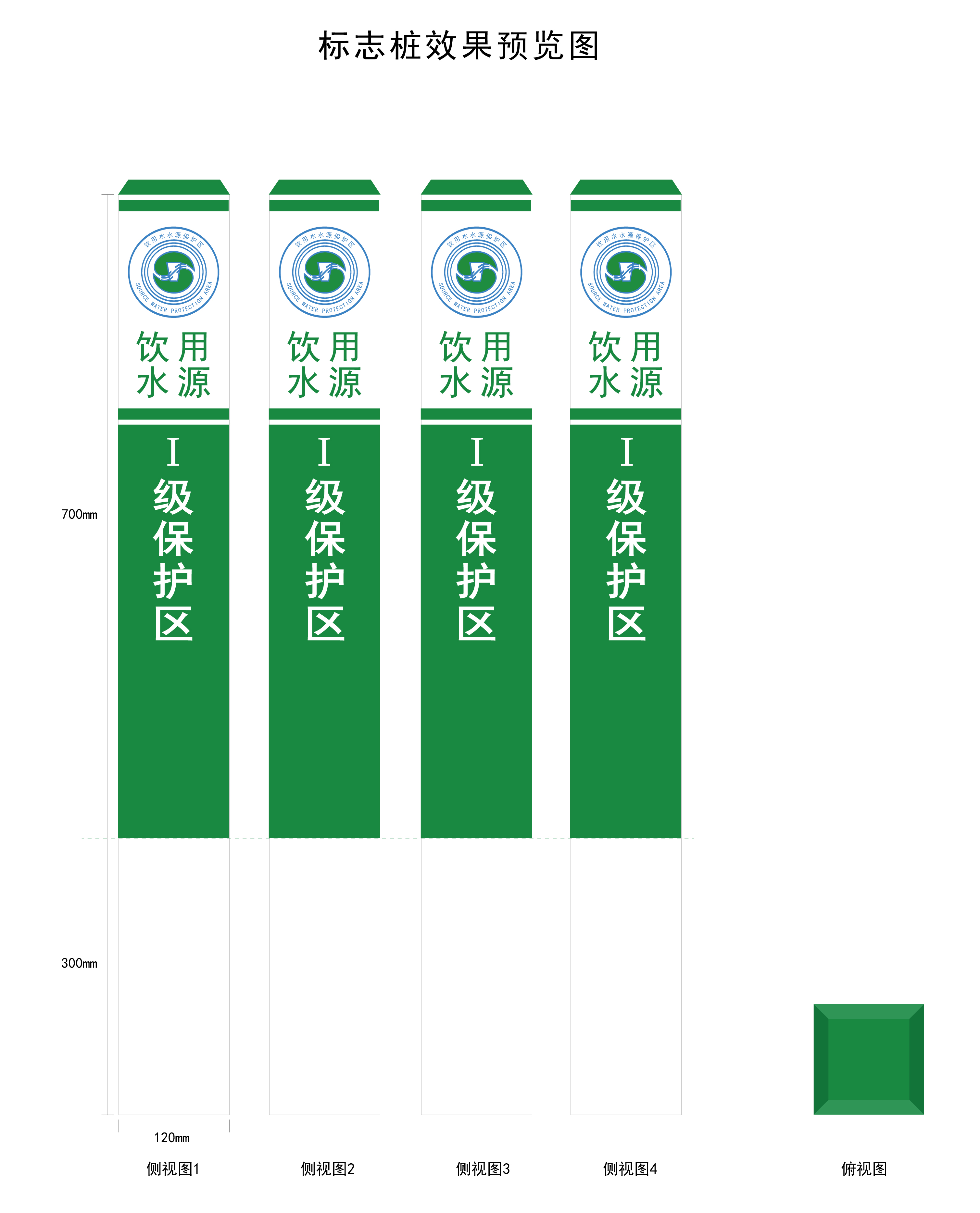 1、漸變色LOGO。2、樁體呈白綠色,印字加飲用水源保護(hù)區(qū)、電話(huà)信息等。