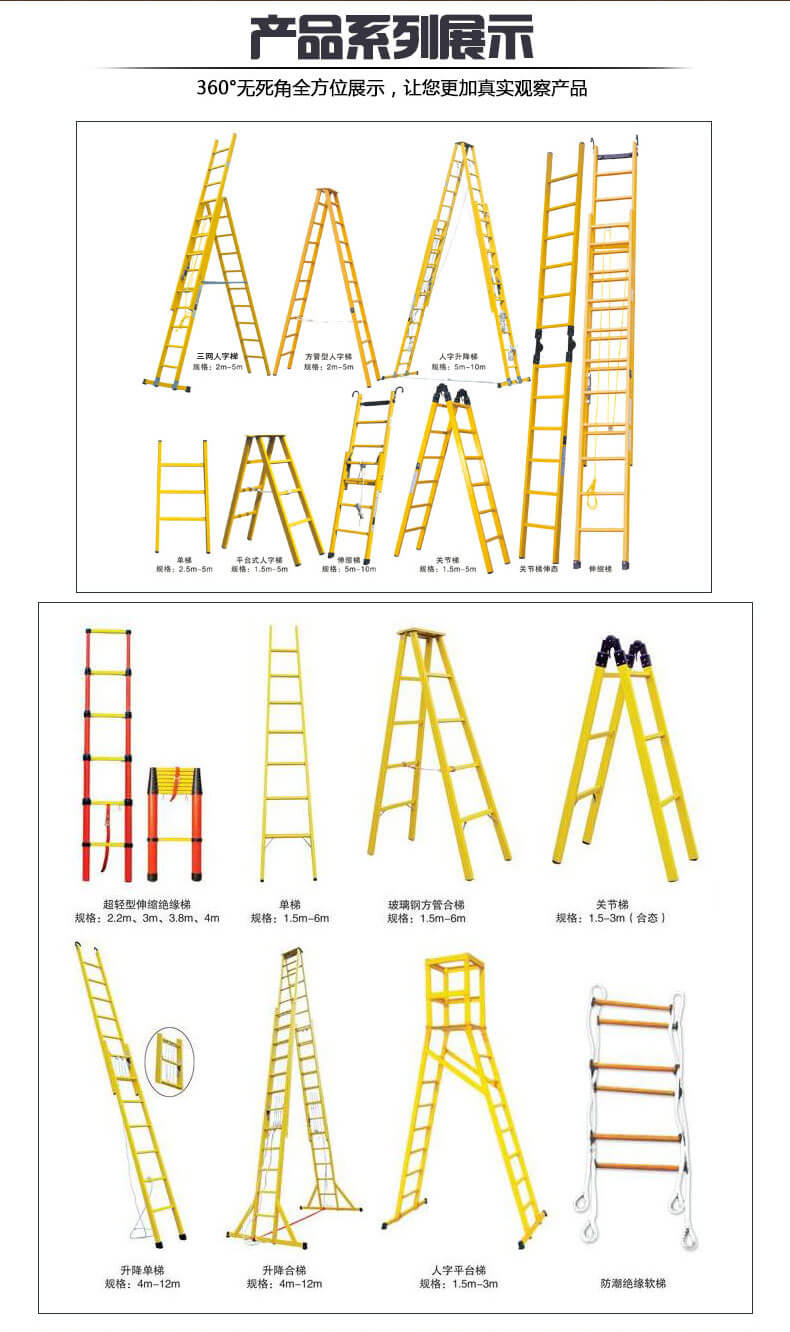 分類絕緣梯分為絕緣單梯,絕緣軟梯,絕緣竹節梯(魚竿梯),絕緣關節梯,絕緣單直梯,絕緣合梯,絕緣人字梯,絕緣升降梯(絕緣人字單升降梯,絕緣伸縮合梯,絕緣伸縮人字梯),絕緣凳,絕緣踏步凳,絕緣高低凳,絕緣高凳,絕緣升降平臺,全絕緣腳手架等 。